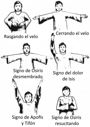 Al hacer el signo «L», el adepto dice: «Signo de Isis llorando». Esto expresa el dolor de Isis por la muerte de Osiris, que fue asesinado por Set o Apofis. Al hacer el signo «V», el adepto dice: «Signo de Apofis y Tifón», que expresa los nombres de Set, el hermano enemigo asesino de Osiris. Cuando el adepto cruza los brazos sobre el pecho, dice: «El signo de Osiris asesinado» y luego «Y arriba. Isis, Apofis, Osiris, IAO».
